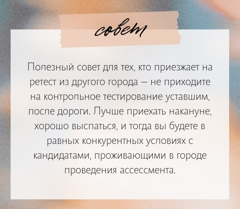 Сам процесс ретеста не отличается от дистанционного тестирования. Стандартное время, отведенное на тест, – около 60-70 минут.